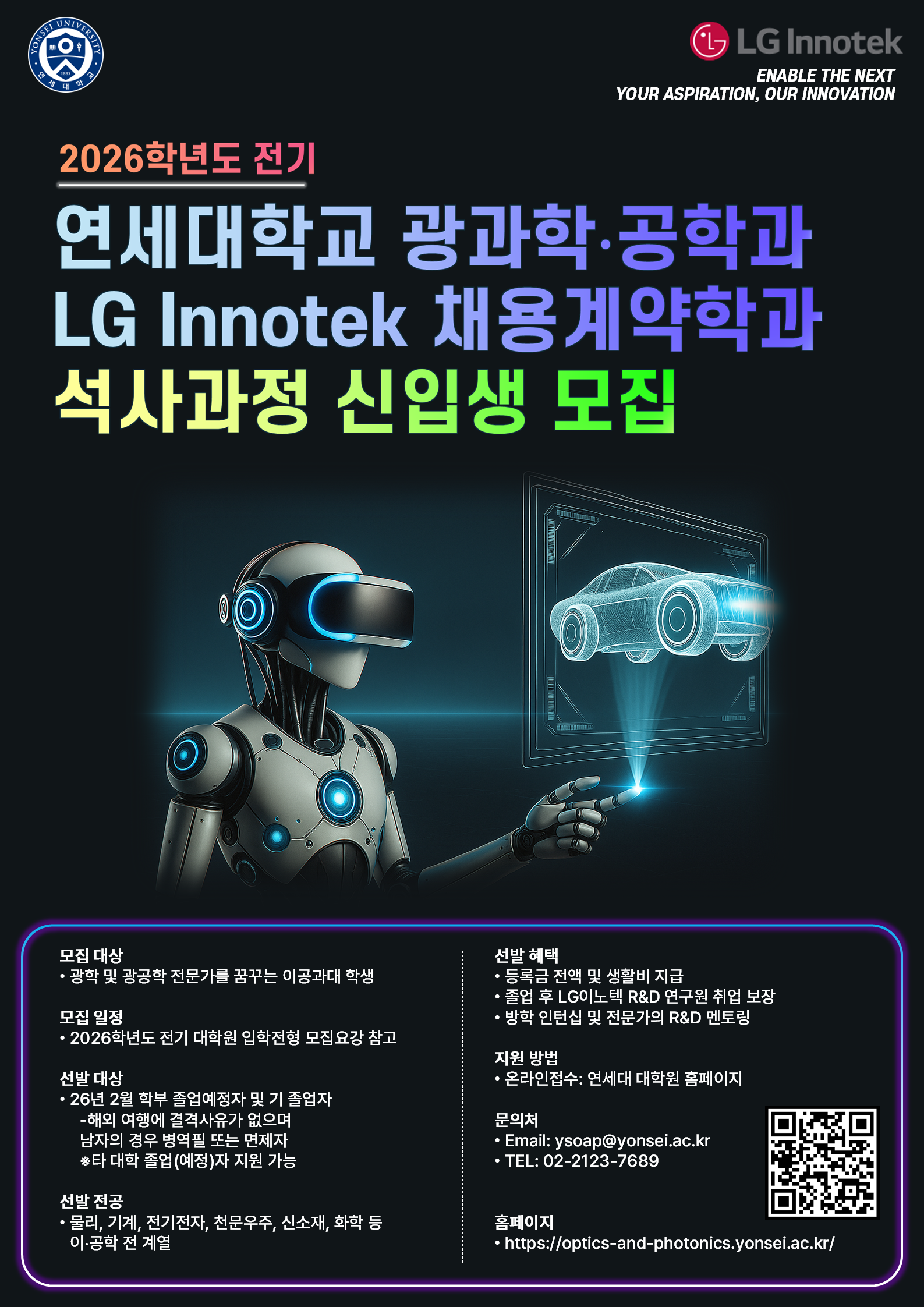 연세대학교 일반대학원 계약학과인 광과학공학과에서 26학년도 전기 신입생(석사과정)을 모집합니다.