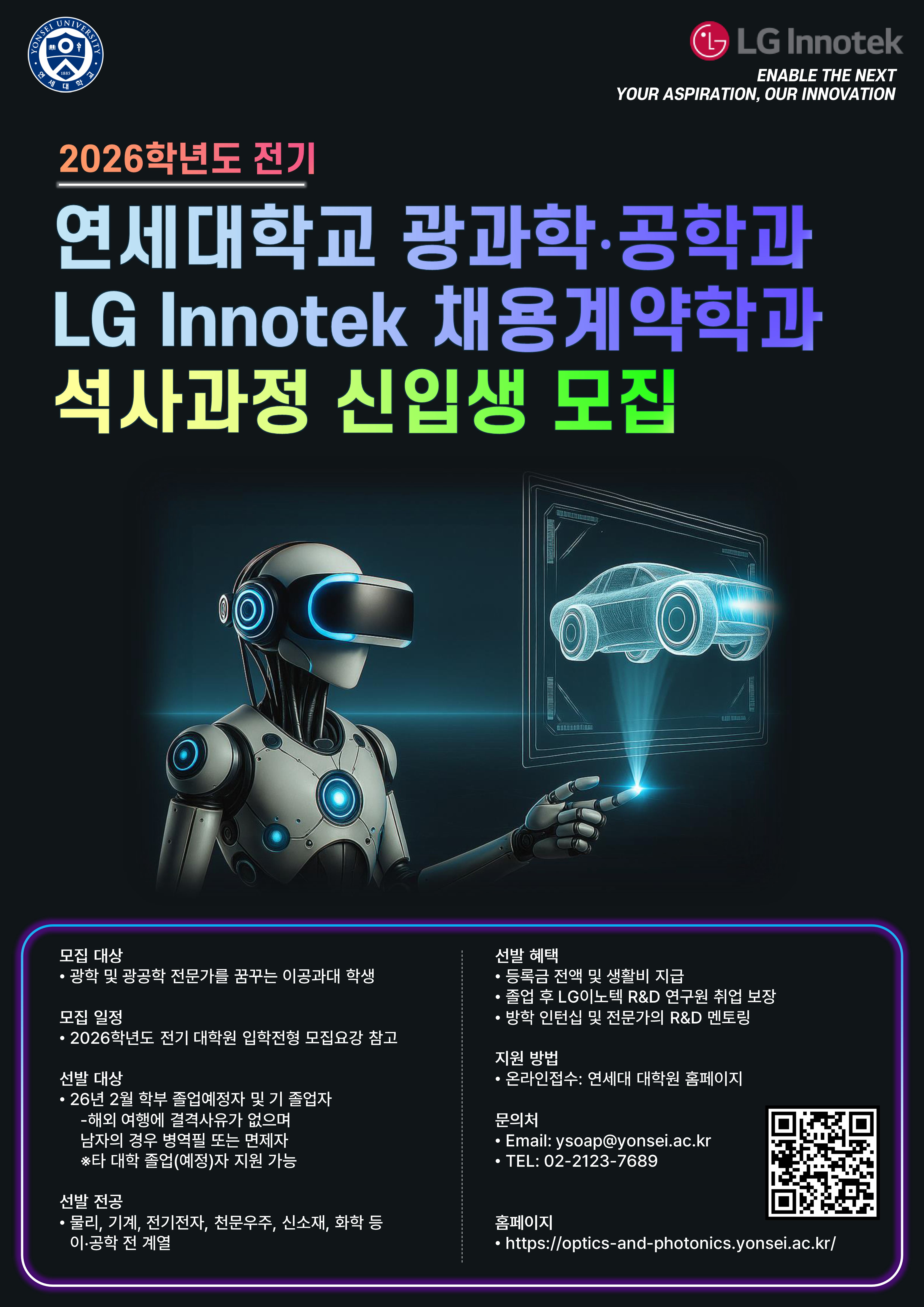 연세대학교 일반대학원 계약학과인 광과학공학과에서 26학년도 전기 신입생(석사과정)을 모집합니다.